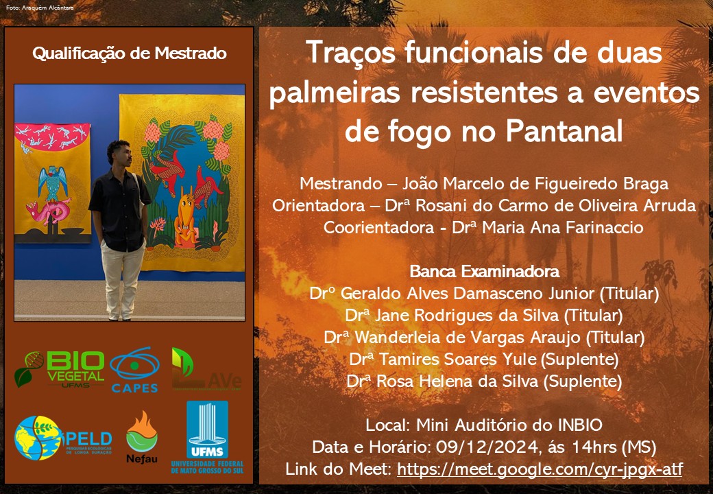 O Programa de Pós-Graduação em Biologia Vegetal convida todos para comparecerem ao Exame de Qualificação de Dissertação do mestrando João Marcelo de Figueiredo Braga, cujo trabalho intitula-se “Traços funcionais de duas palmeiras resistentes a eventos de fogo no Pantanal.” , desenvolvido sob orientação da doutora Rosani do Carmo de Oliveira Arruda, e coorientação da doutora Maria Ana Farinaccio. – Data: ...