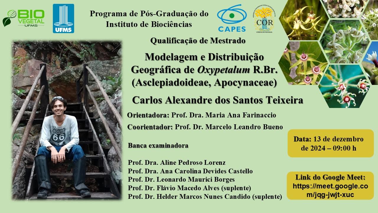 O Programa de Pós-Graduação em Biologia Vegetal convida todos para comparecerem ao Exame de Qualificação de Dissertação do mestrando Carlos Alexandre dos Santos Teixeira, cujo trabalho intitula-se “Modelagem e Distribuição Geográfica de Oxypetalum R.Br. (Asclepiadoideae, Apocynaceae).” , desenvolvido sob orientação da doutora Maria Ana Farinaccio, e coorientação do doutor Marcelo Leandro Bueno. – Data: 13/12/2024 (sexta-feira) – Horário: 9h (horário ...
