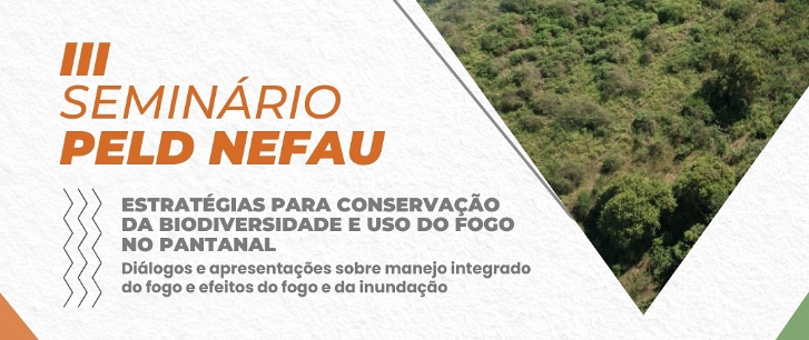 O projeto PELD NEFAU anunciou publicamente através de suas mídias de comunicação nesta terça-feira (19/11) o acontecimento da 3º edição do seminário do projeto, que tem como objetivo “apresentar resultados parciais das pesquisas, com diálogos sobre manejo integrado do fogo e efeitos do fogo e da inundação na biodiversidade pantaneira”, segundo consta na divulgação. Banner de divulgação do 3º Seminário ...