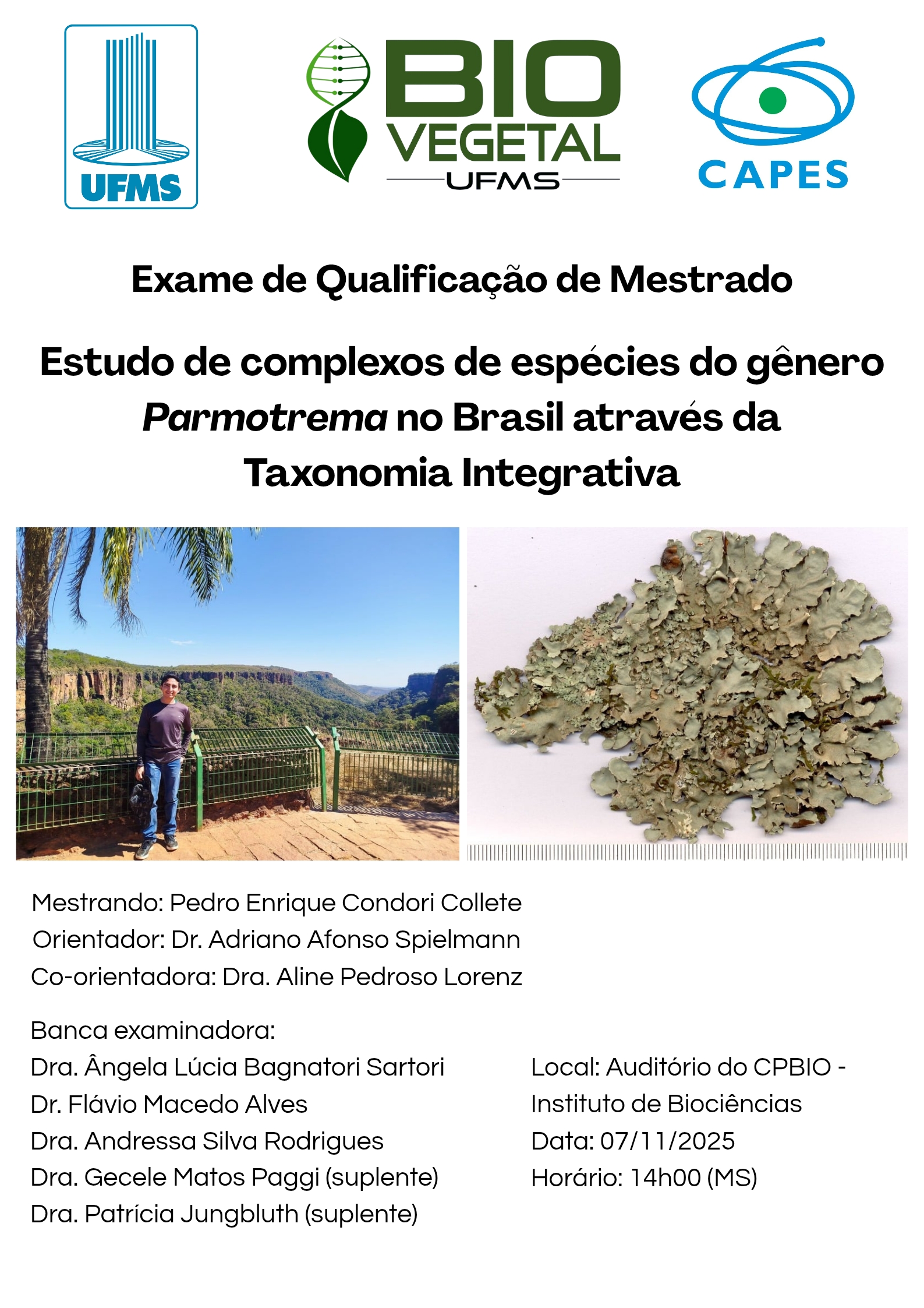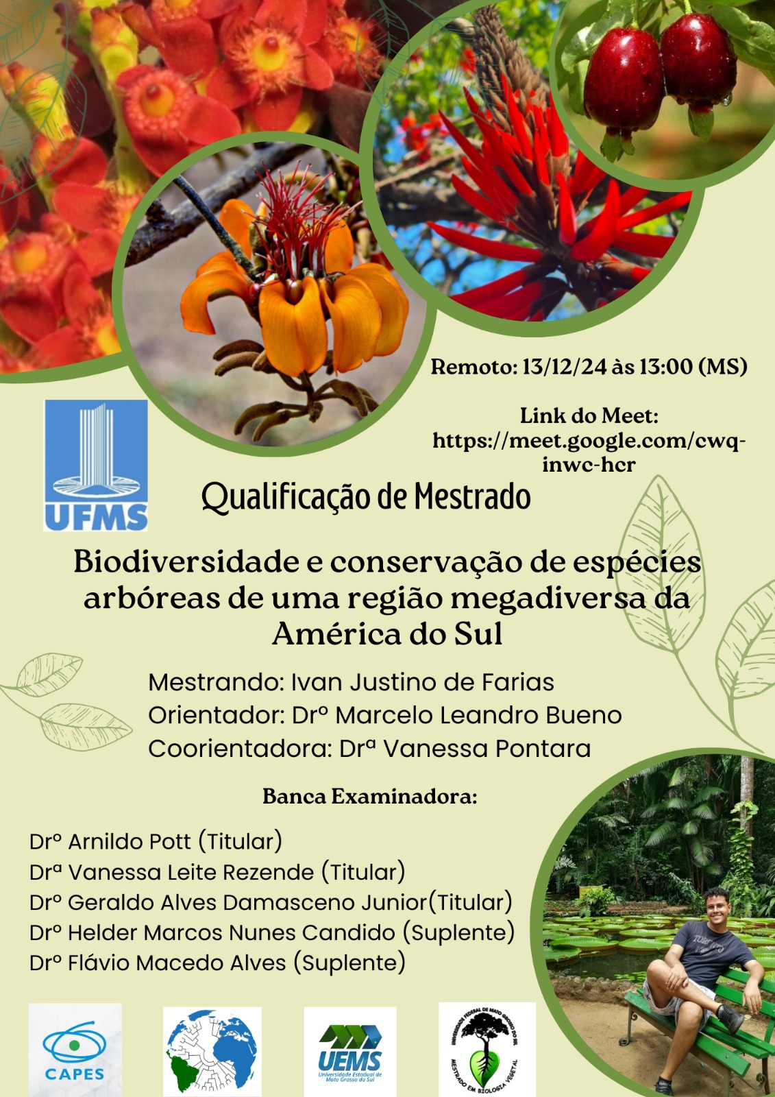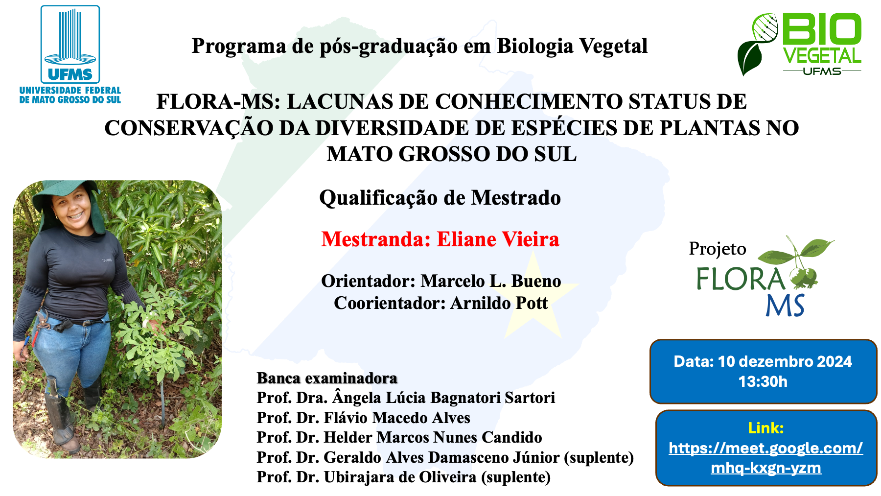 O Programa de Pós-Graduação em Biologia Vegetal convida todos para comparecerem ao Exame de Qualificação de Dissertação da mestranda Eliane Vieira, cujo trabalho intitula-se “Flora-Ms: Lacunas de Conhecimento Status de Conservação da Diversidade de Espécies de Plantas no Mato Grosso do Sul.”, desenvolvido sob orientação do doutor Marcelo Leandro Bueno, e coorientação do doutor Arnildo Pott. – Data: 10/12/2024 (amanhã) ...