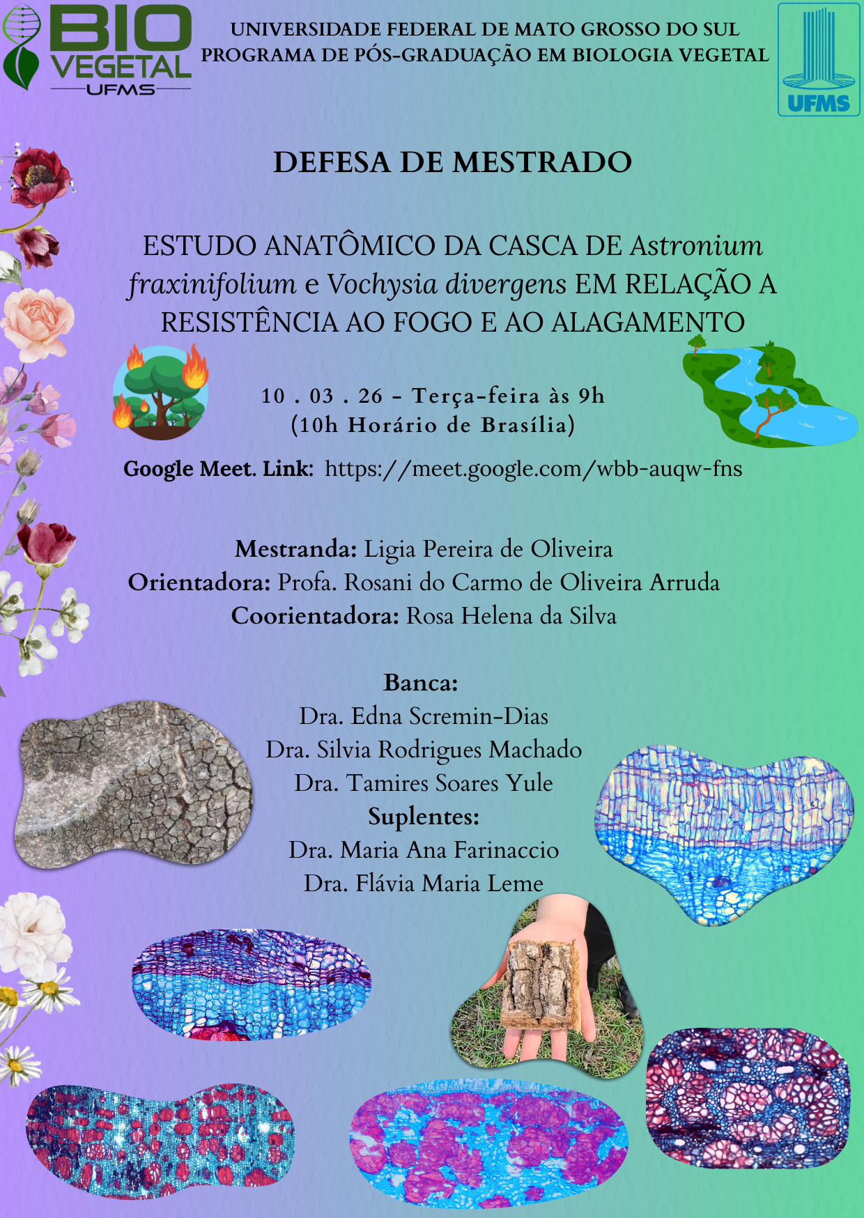 O Programa de Pós-Graduação em Biologia Vegetal (PPGBV/UFMS) convida a comunidade acadêmica e o público interessado para a sessão pública de defesa de dissertação de mestrado da mestranda: 🎓 Ligia Pereira de Oliveira 📘 Título da Dissertação:“ESTUDO ANATÔMICO DA CASCA DE Astronium Fraxinifolium e Vochysia divergens EM RELAÇÃO A RESISTÊNCIA AO FOGO E AO ALAGAMENTO” 📅 Data: 10 de março ...